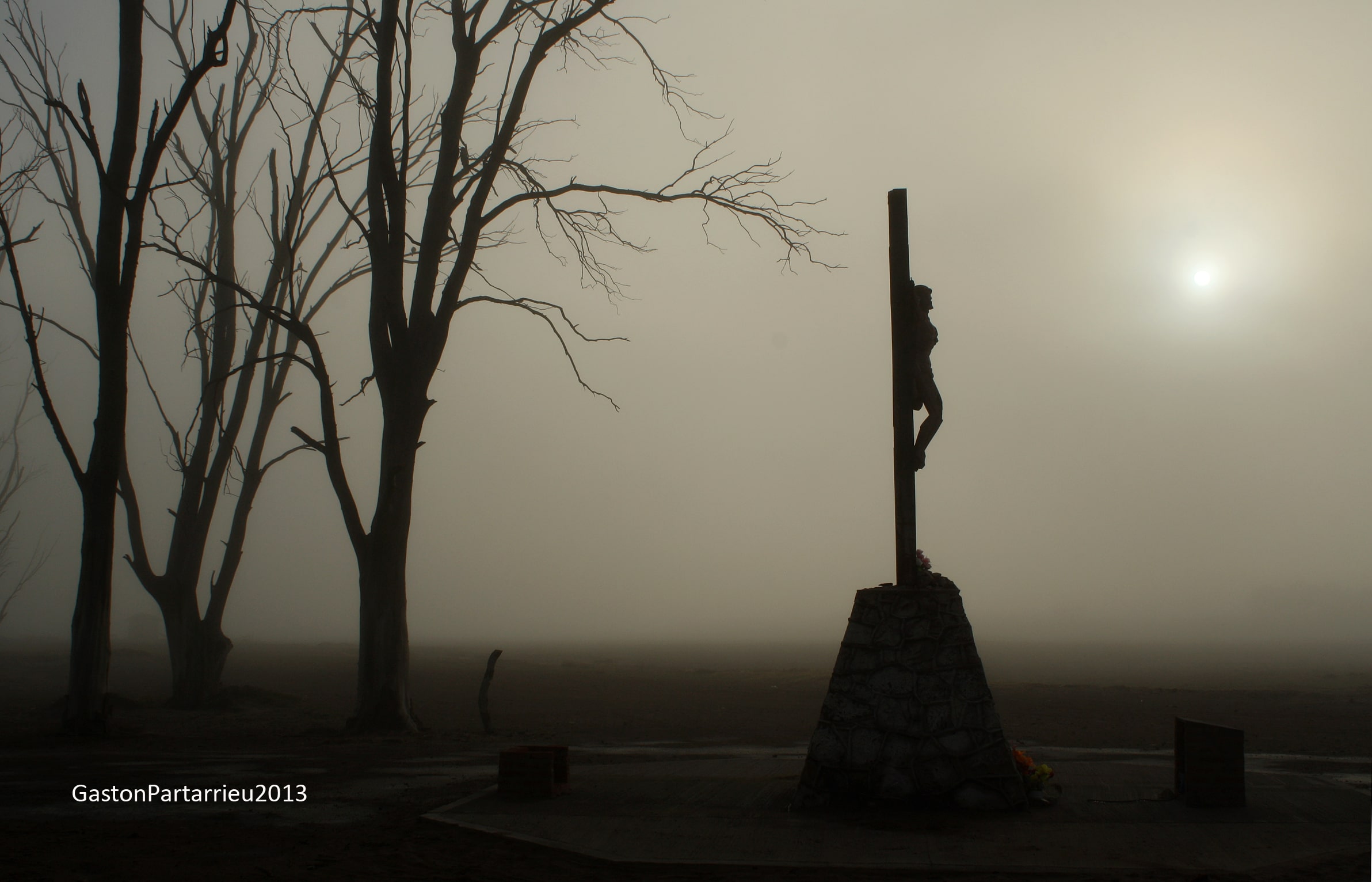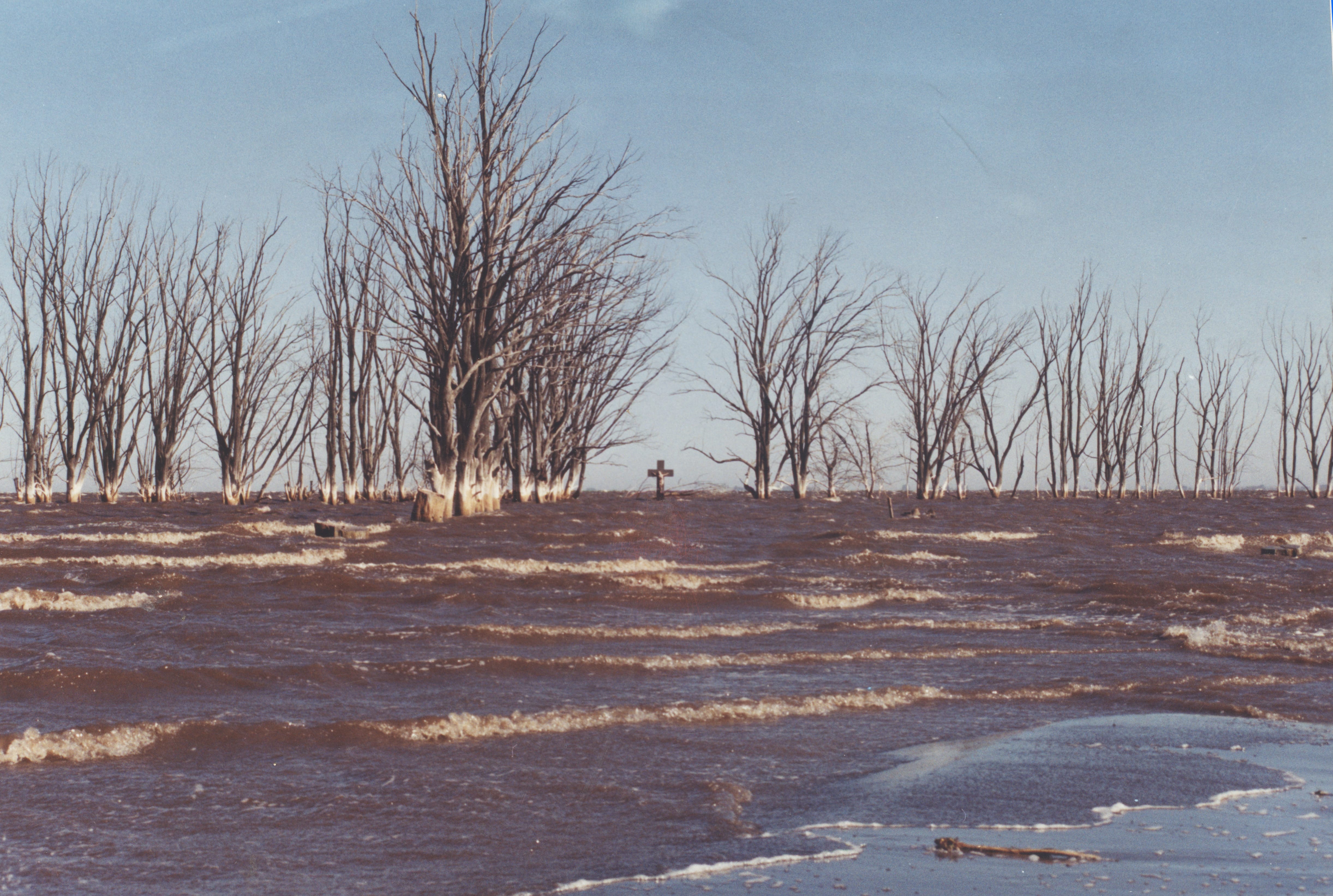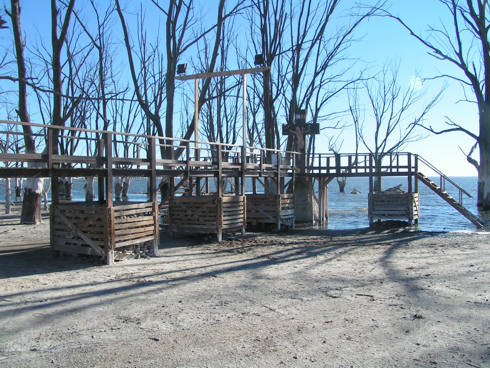 Con el tiempo el Cristo del Camino fue utilizado por devotos para dejar ofrendas y pequeñas placas. Así estuvo por casi 50 años dándole la espalda a la laguna. A partir de noviembre de 1985 el agua de la crecida que sepultó a Epecuén comenzó a rodearlo. Como la laguna continuaba subiendo, entre 1987 y 1988 a 200 metros del Cristo se efectuó una muralla o terraplén, dejando a la imagen de Salamone perdida entre los arboles ya secos que habían sabido ser su sombra y reparo. Y Así ya nadie quiso pensar más en él. Todos estábamos abocados al acuciante tema hídrico por un lado, y a recuperar la actividad turística, por el otro.