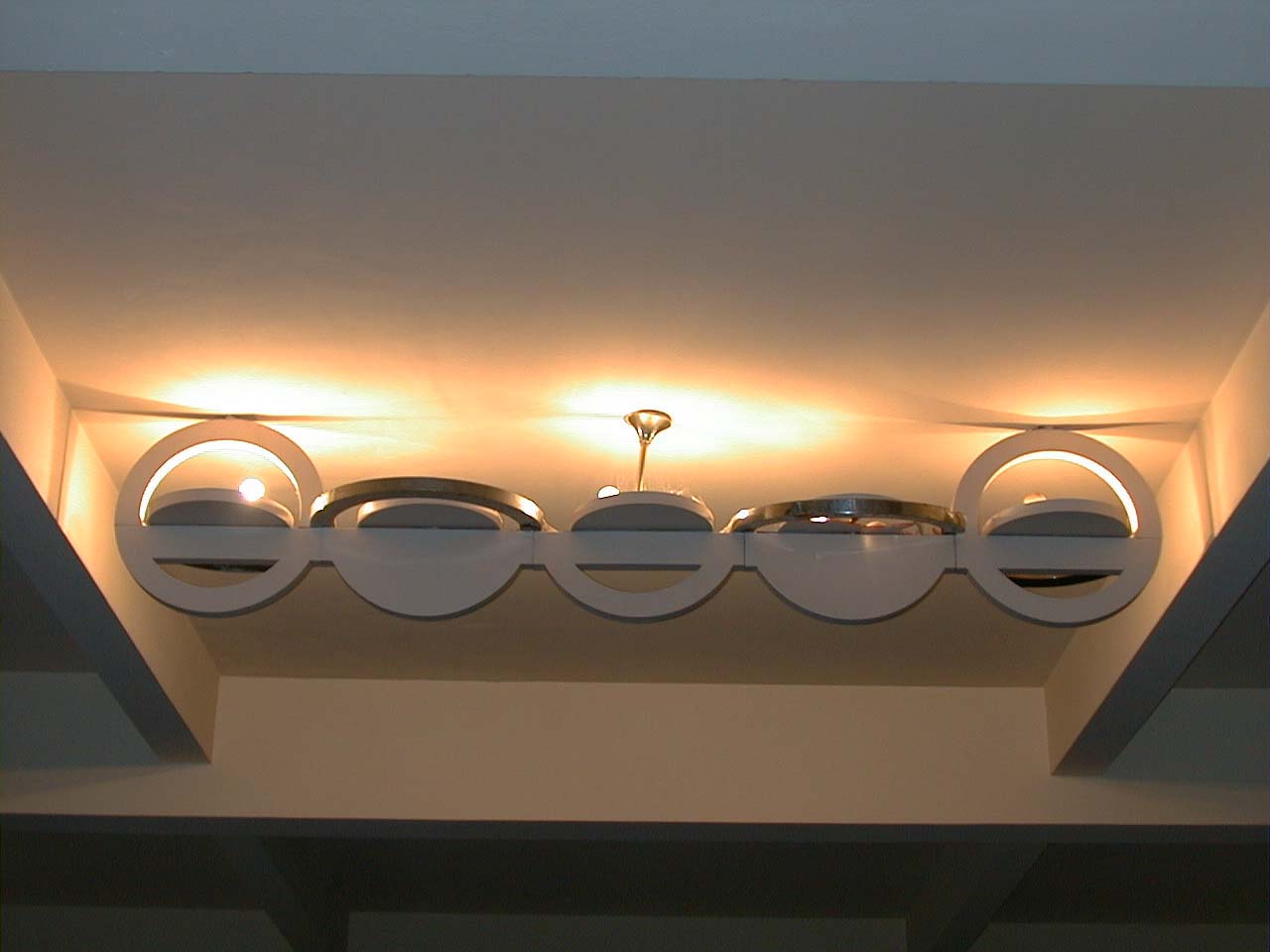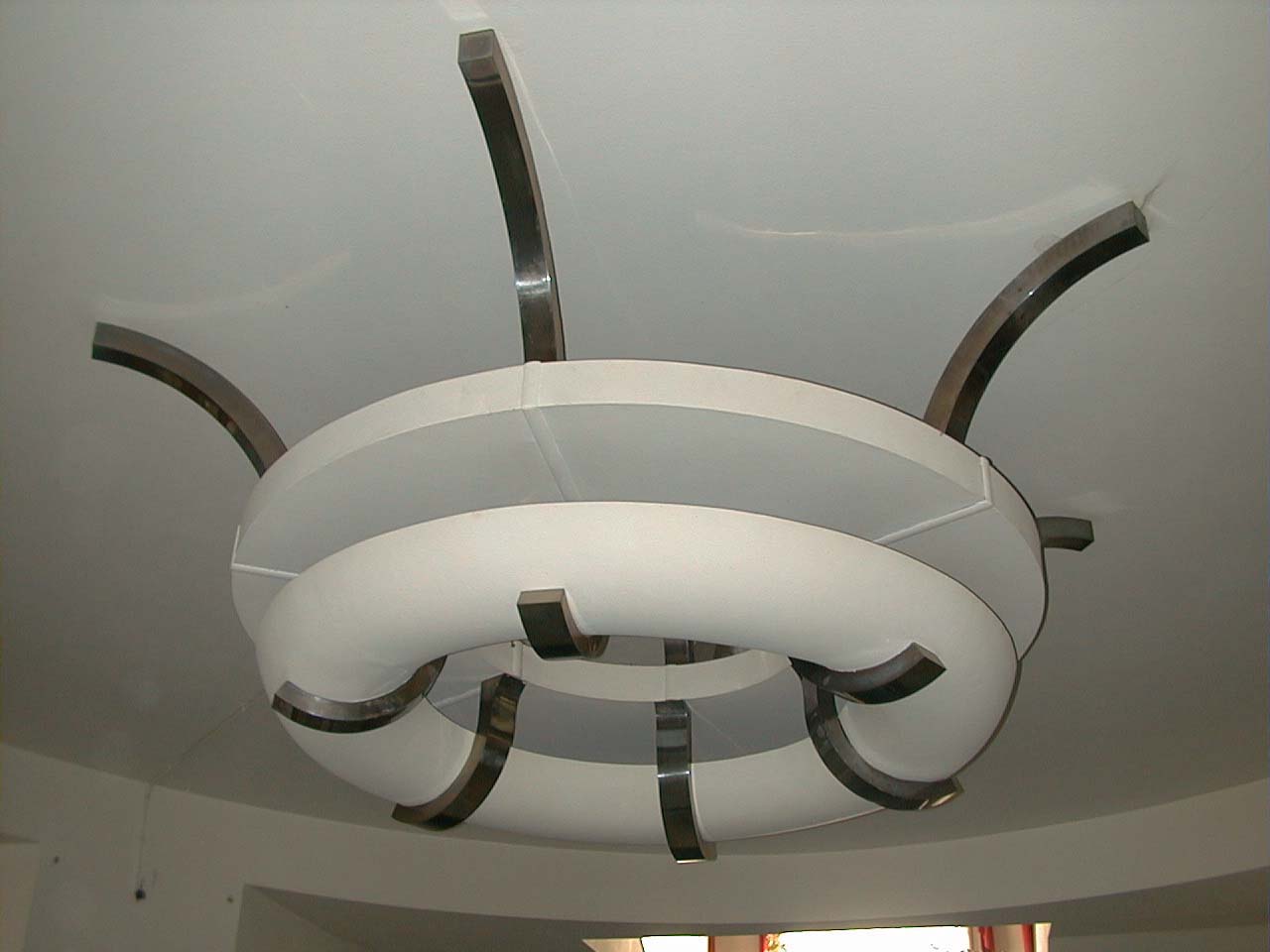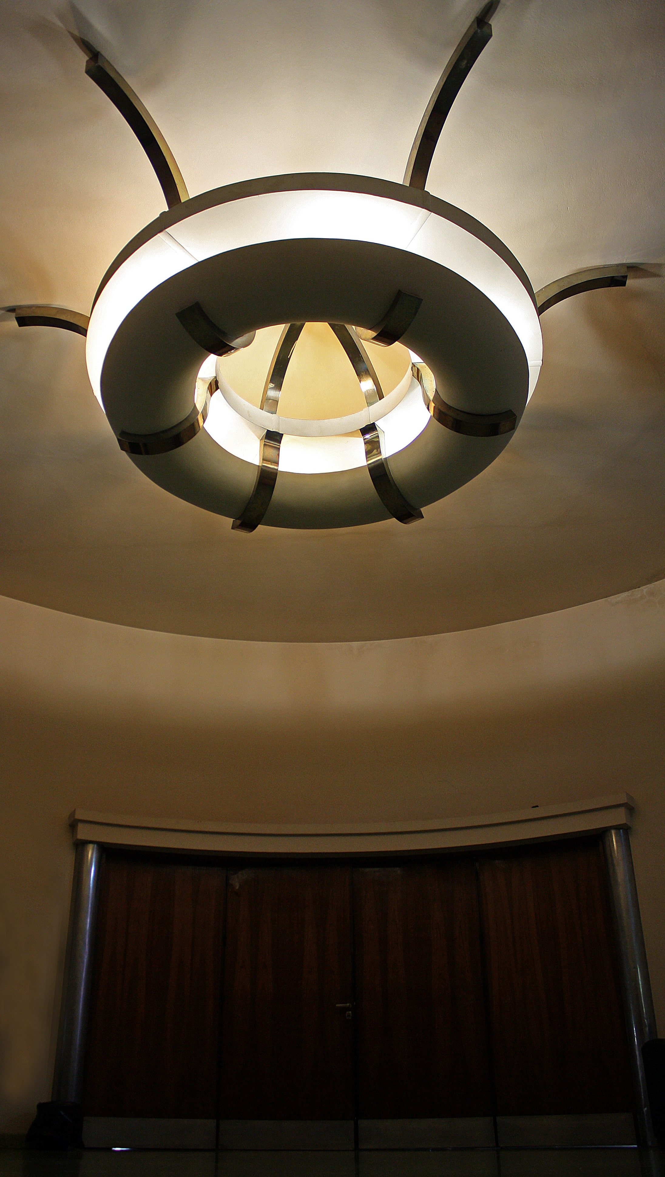 En el hall central de planta alta se colocó una luminaria de gran tamaño (hoy pintada de blanco) cuya combinación era en metal cromado, metal “al duco azul” y “al duco verde”. Esta gran luminaria es idéntica a la colocada en el hall central de la planta baja.