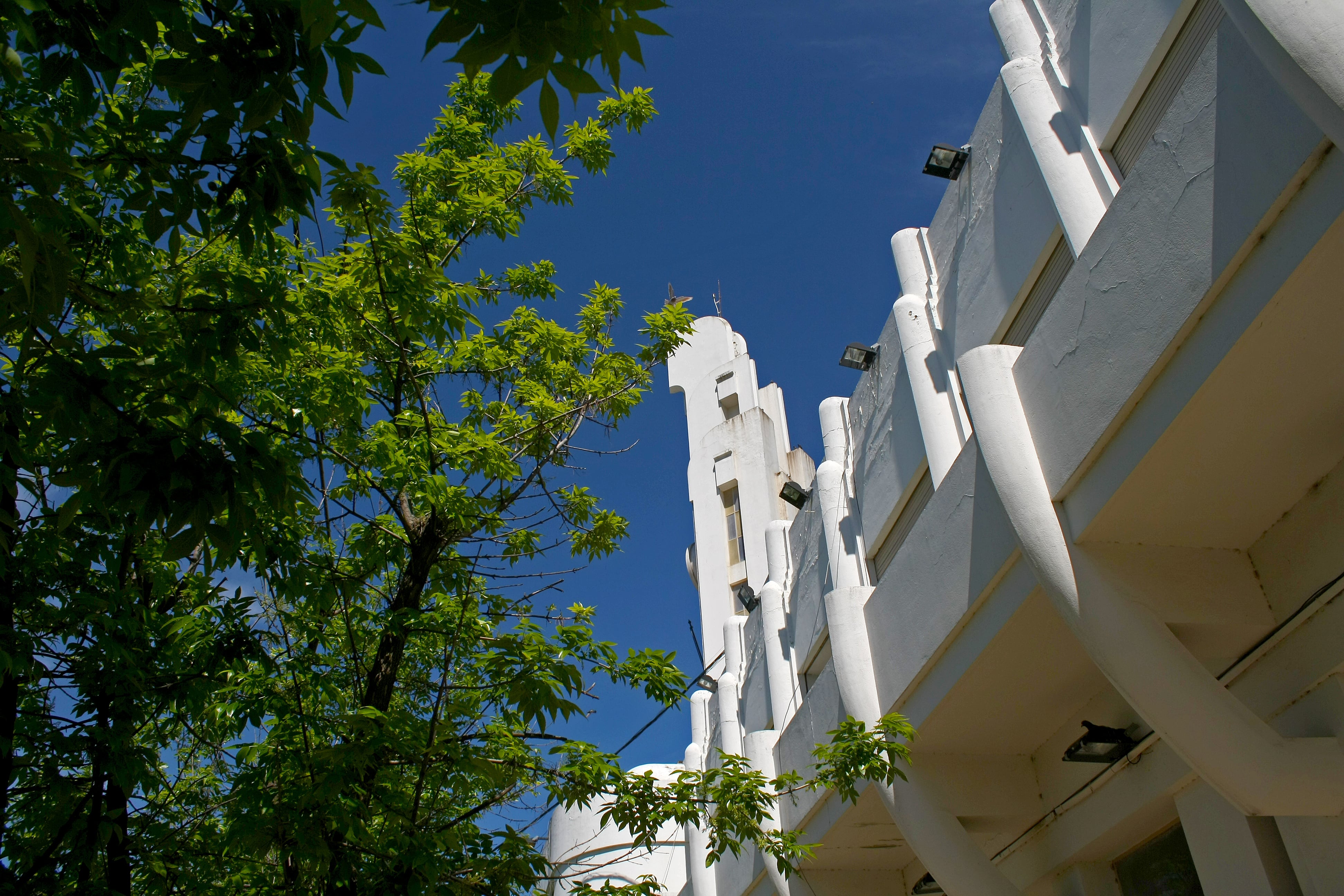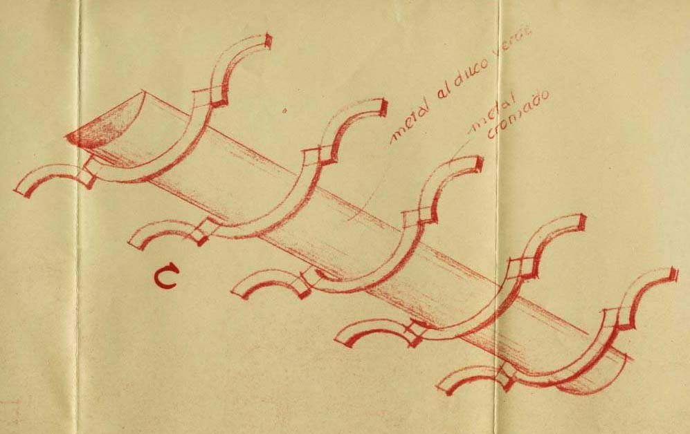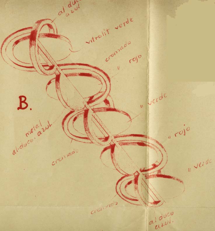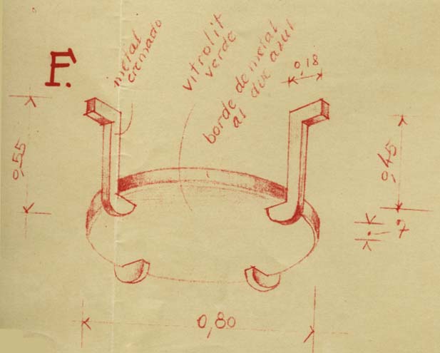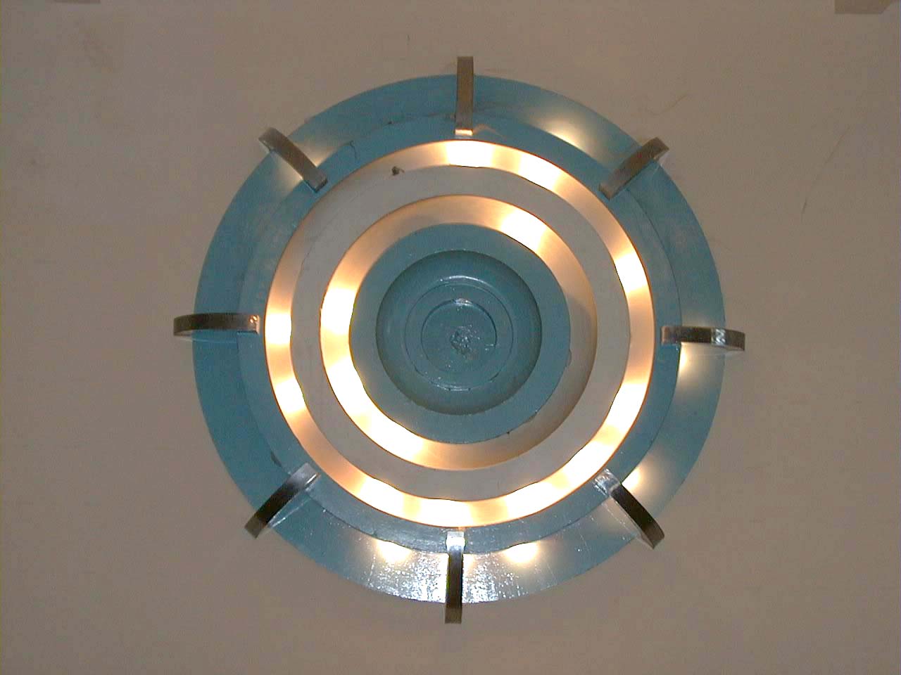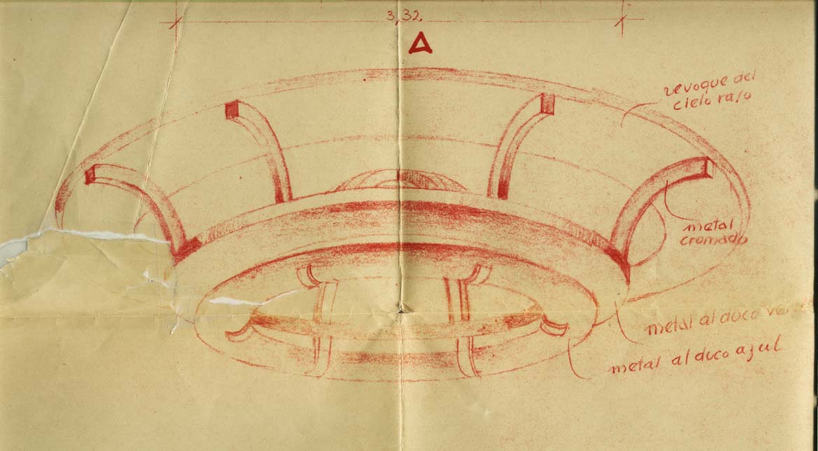 PLANTA ALTA: eran 8 los tipos de artefactos, todos en el mismo estilo y colores. En el Salón de Fiestas y Confitería se dispusieron 4 tipos de luminarias. La gran “escarapela” sobre el fondo del Salón no fue concebida como un adorno patrio, sino como un “motivo ornamental”. Su función era ser una especie de artilugio de luz y sonido para acompañar a las orquestas o musicalizar el salón de fiestas (hoy lo llamamos Salón Blanco). Sus colores originales, por ejemplo, eran azules, colorados, amarillos y verdes, con detalles de cromo. El altoparlante se ubicaba en medio del gran artefacto y las bombillas blancas por detrás, quedaron ocultas y dando una luz indirecta, refractada en distintas tonalidades debido a la pintura del ornamento. Al parecer antes alrededor de 1943 fueron cambiados a los colores patrios. Las demás luminarias del Salón Blanco, hoy en un marrón, eran de plafones “vitrolit” colores verde y rojo, combinados con cromados y con pintura al duco Azul. Originalmente 4 luminarias similares iba a llevar el Salón Blanco, pero con la reducción del tamaño del edificio la realidad indicó que se colocaron 2 de forma alargada y una circular.