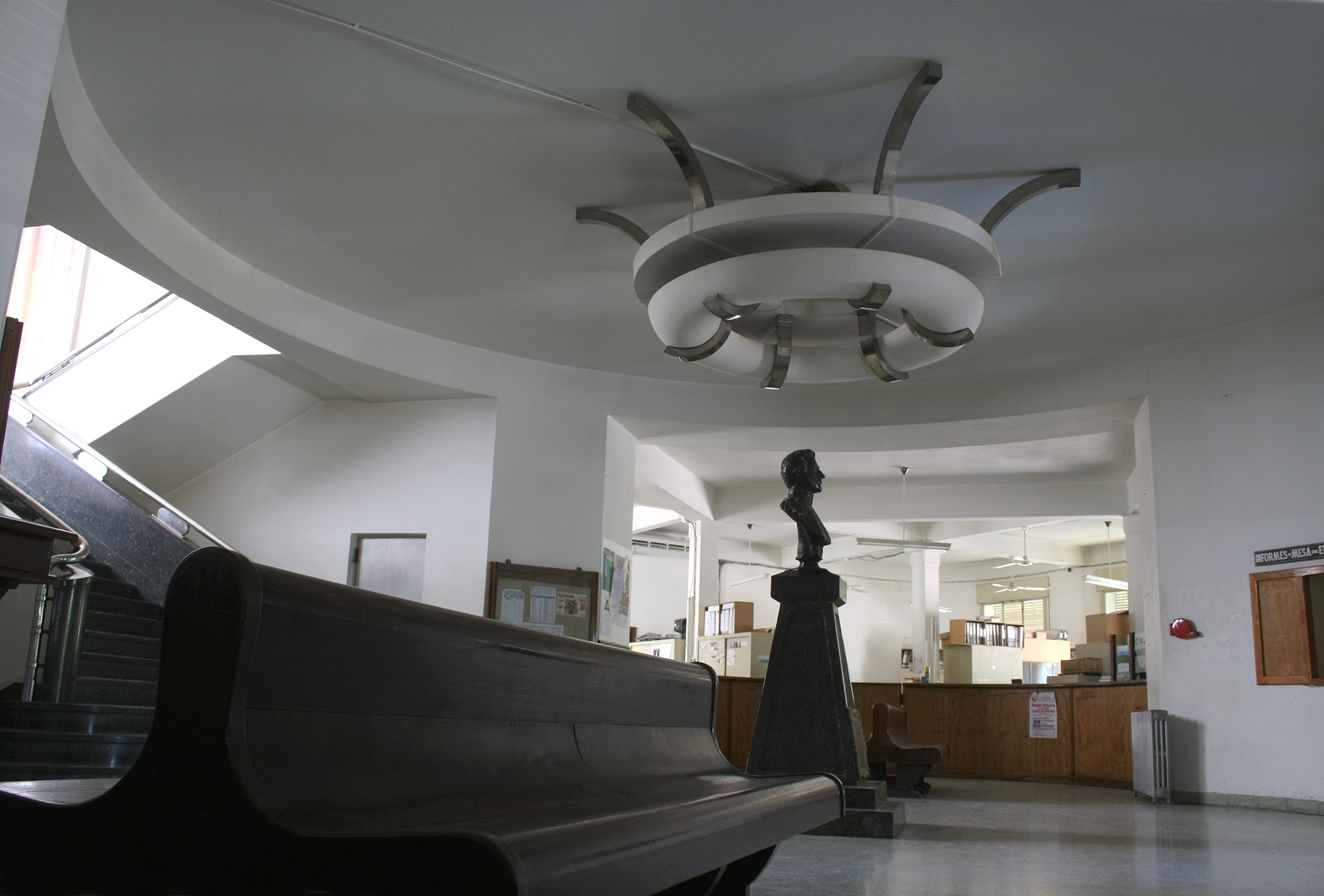 PLANTA BAJA : son 7 los modelos de luminarias que abrió Salamone. Solo la gran luminaria del hall es de importancia, mientras que el resto son las pensadas para áreas de trabajo y espacios comunes. Al ingreso, antes de la puerta final se encuentra una de las pocas luminarias originales del edificio, en opalina verde.