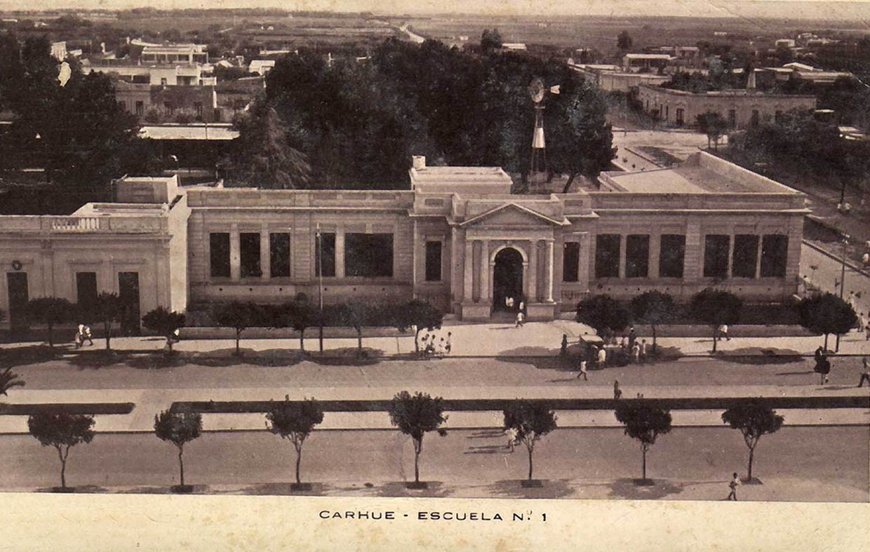 Mientras duró la permanencia del Ejercito en Carhué (1882) los niños no tenían la posibilidad de recibir ningún tipo de educación. Es así que el estado comienza las gestiones para crear una escuela, la primera Escuela del territorio que, hasta 8 antes era dominio aborigen. Por ley se crea entonces en 1884 la Escuela Nº 1 de niños y la Nº 2 de niñas que funcionaban juntas, separados por un paredón.