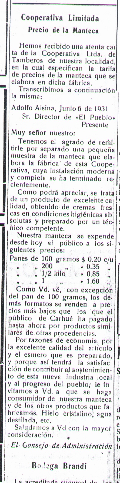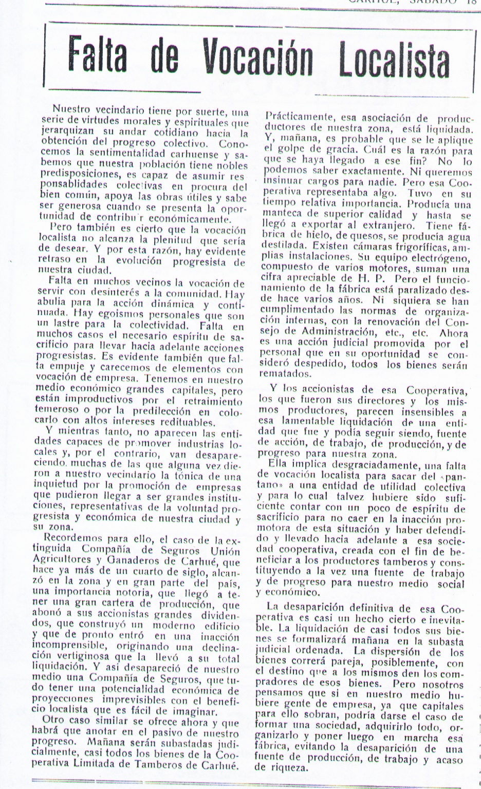SE FUNDABA LA COOPERATIVA DE TAMBEROS DE CARHUE