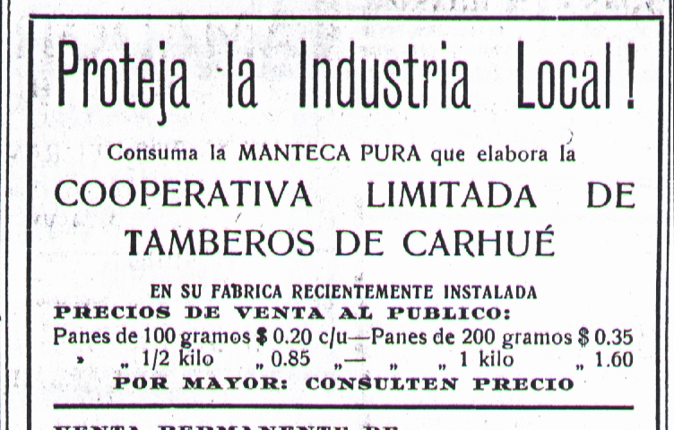 Gracias a este fomento a nivel nacional, los productores locales se agrupan para darle un valor agregado a su producción, creando la “Cooperativa de Tamberos de Carhué”que fue autorizada por el Superior Gobierno de la Pcia. de Bs.As. con fecha 25 de Septiembre de 1930.8 Sus instalaciones, según cédula catastral, fueron culminadas en 1930 y poseían una sup. de 442 m2, habiendo sido adquirido el terreno por la Cooperativa a Juan M. Lamberto, su primer presidente y uno de los mayores accionistas. La fábrica contaba con 1 hall, 3 habitaciones, 1 cocina, 1 baño y 1 depósito o taller. 9