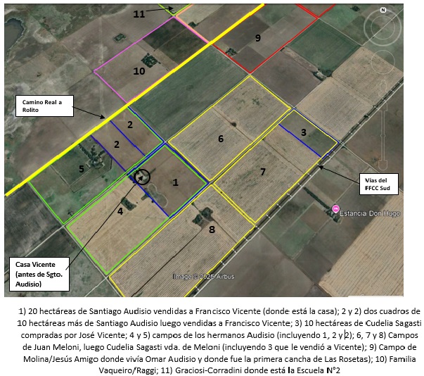 Los Vicente se mudaron de esa zona poco después que los Amigo (quiénes lo hicieron en la primera parte de la década del ’30) pero, a diferencia de éstos que se establecieron inmediatamente en el Paraje Cilley, se asentaron primeramente en el pueblo de Carhué. Allí, pusieron un almacén ubicado en la esquina norte de Avellaneda y Dorrego. En este lugar estuvo luego el bar de Angerami y posteriormente fue la vivienda de la familia Oliari (miembros de la Iglesia evangélica de la Alianza Cristiana y Misionera de Carhué). Supongo que aquí alquilaban. Estuvieron allí unos años hasta que se asentaron definitivamente en el Paraje Cilley probablemente a fines de los años ’40. Se instalaron en las 20 hectáreas que eran de Santiago Audisio (familia de la que ya he hecho una publicación al respecto) ubicadas a 500 metros del camino real que lleva a Rolito, donde estaba plantada la casa donde Santiago Audisio constituyó a su familia y que ahora vivirían los Vicente. Es posible que primeramente hayan alquilado y después terminan comprando el campo. Luego le compró al mismo hombre, 20 hectáreas más que se encontraban en frente de las 20 primeras, camino de por medio (ver mapa) que dan al camino real que lleva a Rolito. En este lugar se terminaron de criar los hijos de Francisco y Lucía. No alcanzaron a ser alumnos de la Escuela N°2 ya que para cuando se asentaron en el barrio eran adolescentes y habrían terminado la primaria en otro lugar (en el pueblo tal vez).