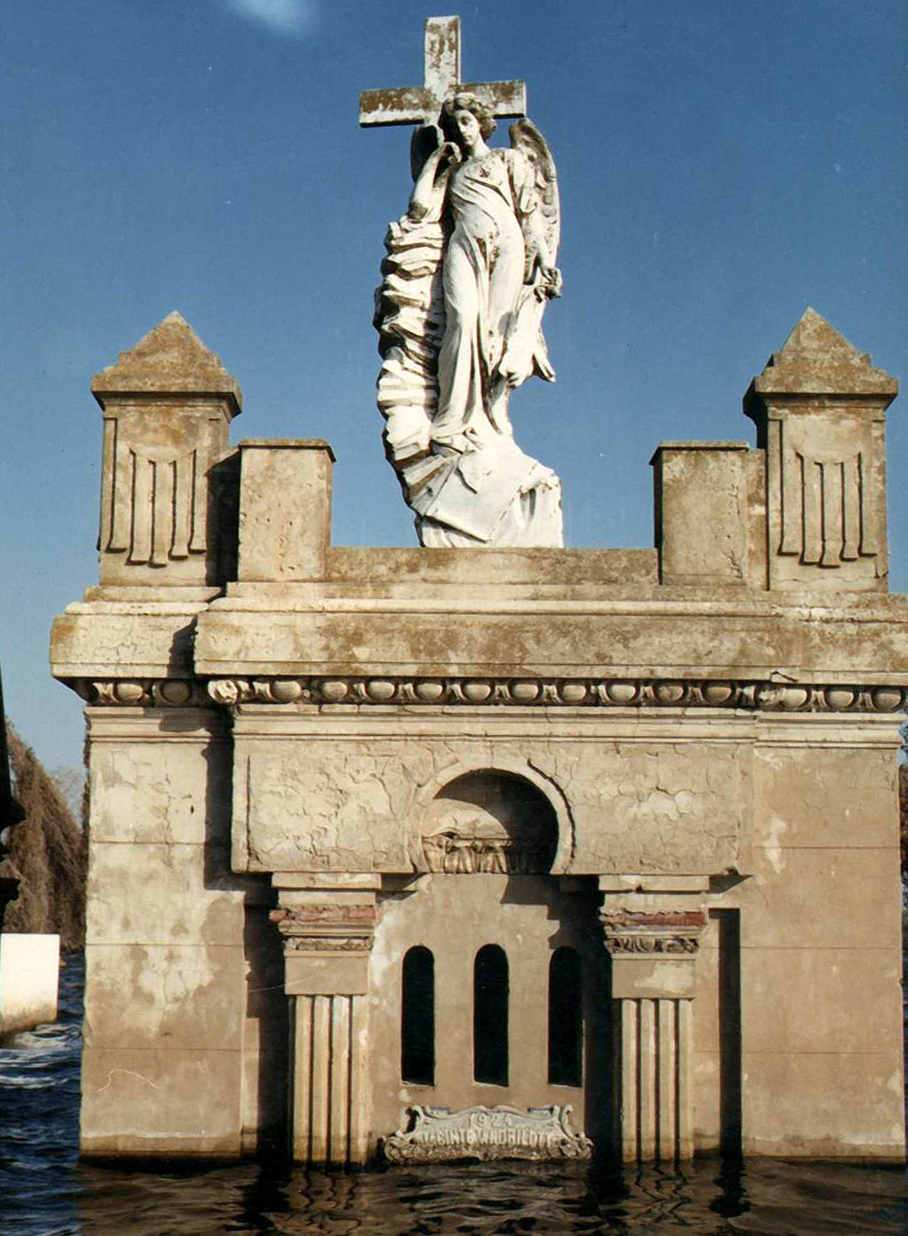Cuando en 1986 la laguna comenzó a inundar el cementerio en la urgencia por evacuar sus deudos, nadie reparó en objetos como el ángel, o las artísticas placas de bronce, o mármoles tallados que abundaban en los cementerios antiguos, tal el caso del de Carhué, de principios del pasado siglo.