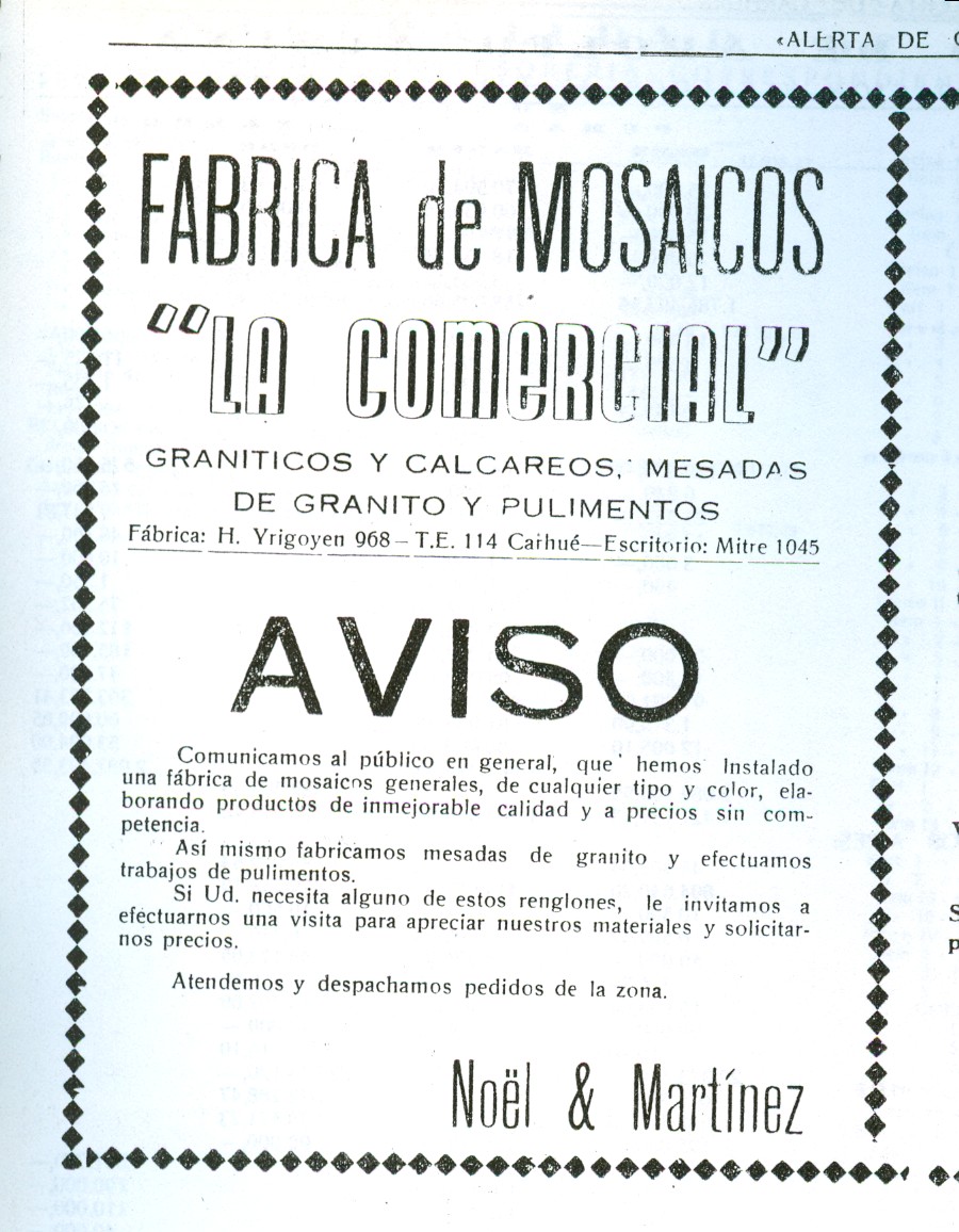 Antes, en 1954 abría sus puertas la fábrica “LA COMERCIAL” en H. Yrigoyen 968 propiedad de Noel & Martínez que fabricaban mosaicos graníticos y calcáreos, mesadas de graito y efectuaban pulimentos. .18