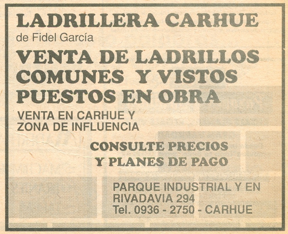 La actividad ladrillera tubo su punto más álgido cuando en 1993 el vecino Fidel García en el predio del Parque Industrial instala la “Ladrillera Carhué” un intento de industrializar esta actividad con material de excelente calidad, pero que no prosperó. 10