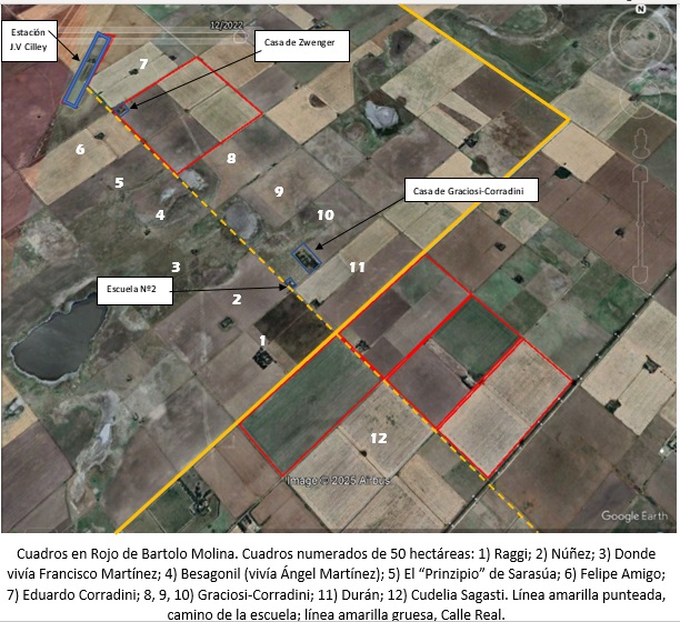 Las otras 100 hectáreas que nos abocan en este artículo es donde Bartolo construyó su casa familiar. La misma destacaba de las demás casas de la zona que solían ser dos o tres dependencias organizadas en “chorizo”, con puertas independientes, a veces con alero y muchas de ellas de adobes y techo de chapa. Algunos cuantos más se daban el lujo de hacerlas de ladrillo, y luego se encontraba la tradicional letrina o excusado que podía ser del mismo material, como también de chapa o adobes. No mucho más, además de algún que otro galpón. Pero la casa de Molina se salía de esos estándares. Una estructura de paredes gruesas de ladrillo, revocada de barro y bien pintada, techo de chapa por fuera y por dentro de madera a listones. Conformada por cinco ambientes que comprendían la habitación matrimonial seguida por un amplio comedor con piso mosaico, luego la pieza de los hijos con piso de ladrillos, la cocina sobre el costado izquierdo de la primera pieza, la cual tenía entrada independiente y piso de ladrillo, y un alero que evitaba estar completamente a la intemperie cuando se pasaba del comedor a la cocina. Cabe destacar que esta casa era la única en el vecindario con piso flotante en la pieza matrimonial, y baño interno con piso de mosaicos, dispositivo de descarga e inodoro de cerámico, en vez de letrina, dos cosas de extrema rareza en una zona rural de chacras pequeñas y familias pobres. Dicha descripción da una idea del nivel socioeconómico de la familia Molina. Este cuadro se encontraba a solo 500 metros de donde empezaban todas las dependencias de la Estación J.V Cilley, en concreto la playa, siguiendo el mismo camino que venía de la escuela, pero hacia el noroeste.