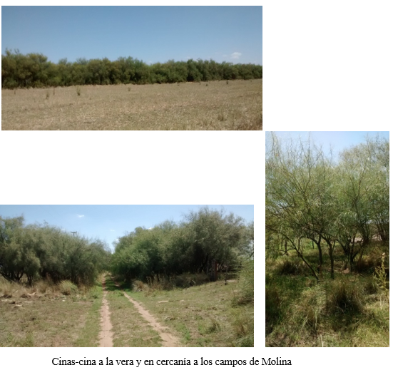 Por otra parte, también resulta característico de la zona la presencia de una planta no autóctona y poco frecuente: las cinas-cina. (Los eucaliptus y tamariscos tampoco son originarios de la región, pero ya se han vuelto habituales). Según contaba mi abuelo, fue un italiano quien las plantó con la intención de formar una cortina que impidiera el paso de los animales hacia la calle, además de servir como protección contra el viento, al igual que los tamariscos. Curiosamente, estas plantas se extienden desde el inicio del campo de Molina, a la vera del camino que viene desde la escuela, hasta encontrarse con el guardaganado del campo de mi abuelo Julio Blengio —otrora playa de la estación J.V. Cilley—, y también bordean el camino perpendicular que recorre el lado noroeste del campo de Molina, desde las vías hasta la otra esquina del campo. Luego, continúan por el camino paralelo al camino de la escuela, delineando el lado nordeste del mismo campo. Curiosamente, terminan donde concluye la propiedad de Molina.