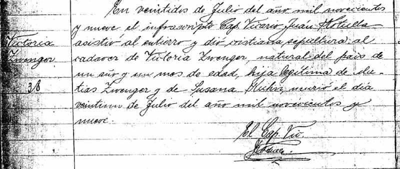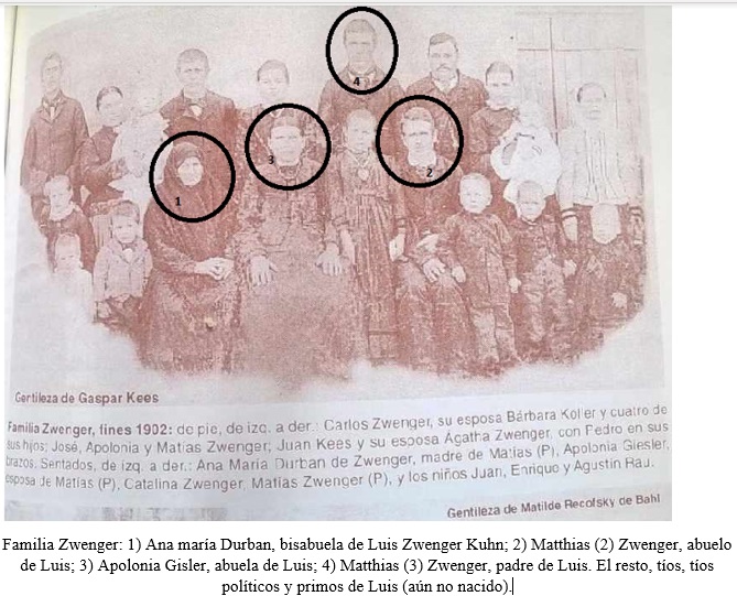 Por su parte, Matthias Zwenger (3) contrajo matrimonio en San Miguel Arcángel con Susana Kuhn, nacida en Rusia en 1881. Tuvieron cuatro hijos, entre ellos el protagonista de nuestra historia: Luis Zwenger Kuhn, nacido en 1904. Sus hermanos fueron: Victoria Zwenger (1908–1909); Catalina Zwenger (1915– …); y Santiago Zwenger (…–1982).