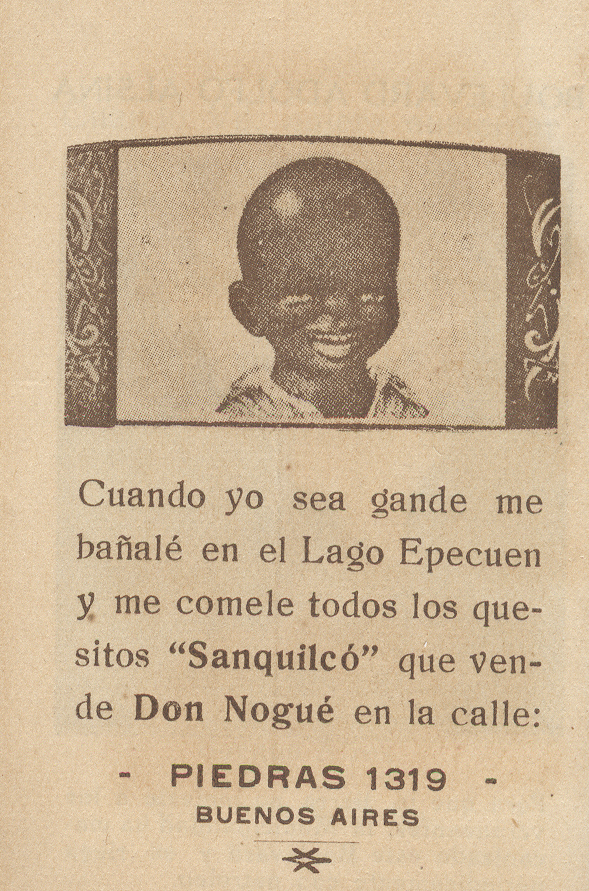 En 1925 un curioso y simpático carnet que era obsequiado a los turistas de Epecuén, promocionaba los “Quesitos Sanquilcó” que vendía un tal “Don Nogué” en calle Piedras 1319. Probablemente los quesos eran fabricados en algún establecimiento ubicado en las inmediaciones de un pequeño arroyuelo afluente del Lago Epecuén llamado así.4