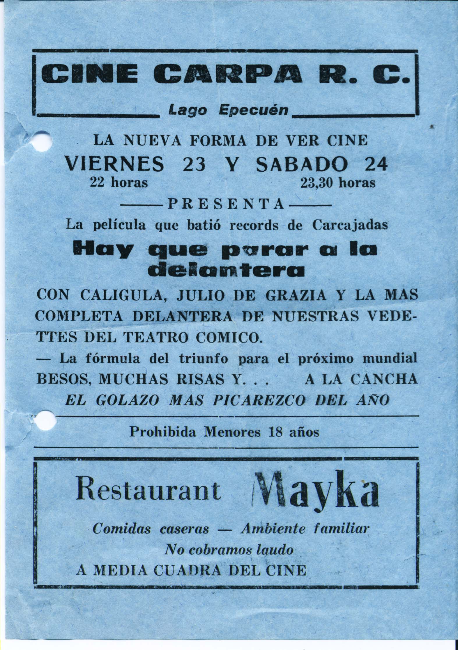 Muchas otras fueron las empresas que intentaron ofrecer diversión y entretenimiento al público carhuense. Los memoriosos recordaran al “Cine Carhué” de Juan Verdini allá a fines de los cuarenta, o el “Cine Gloria”, o el “Colón”, todos en la sala de la Sociedad Italiana. La carpa cine que se montaba en Epecuén durante las temporadas también es parte de la historia de los cines en Carhué.
