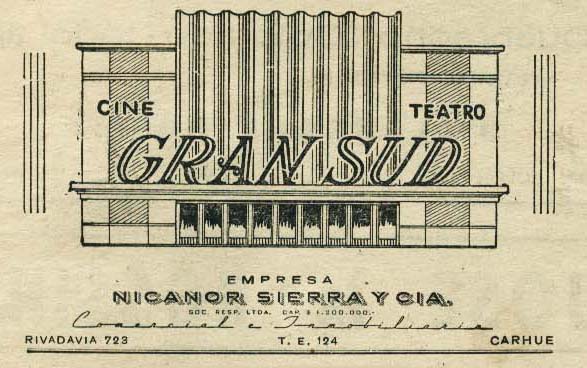 El “Gran Sud” fue construido por los Hermanos Jardo e inaugurado en Agosto de 1951. Fue sin duda la mejor sala de la zona circundante, e incluso en Bahía Blanca era admirada. Su capacidad era superior a las 1000 personas, cuando Carhué no tenía más de 7.000 habitantes. Pocos años después, en 1957, se hace cargo de la sala la empresa Noel & Amodeo, quienes poseían cines en Bs.As. y Bahía Blanca, programando películas novísimas, un lujo para los carhuenses, turistas y pobladores de localidades vecinas.