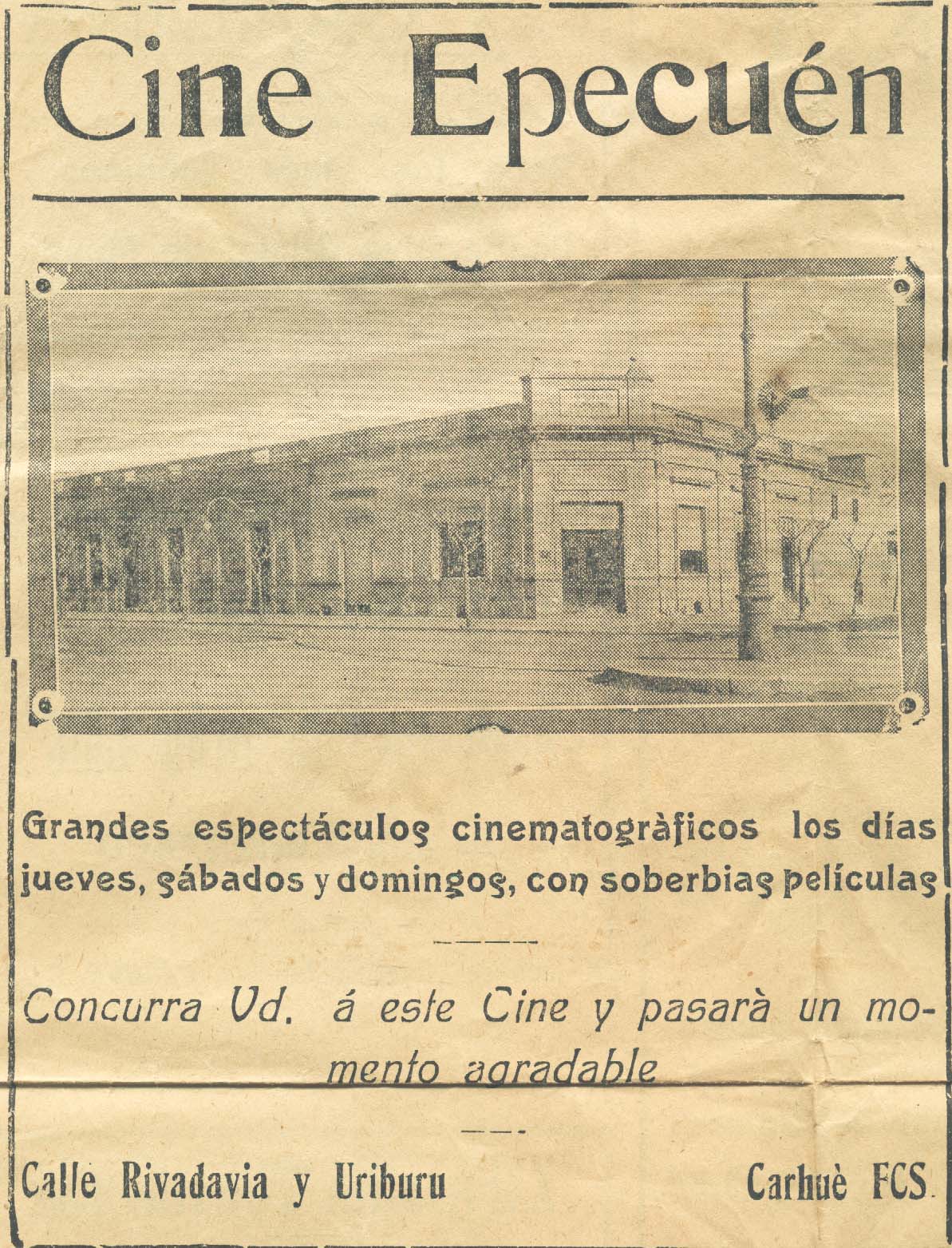Las primeras referencias sobre el cine en nuestra ciudad se tienen gracias a la existencia de un ejemplar del Semanario El Eco de Carhué del año 1903. Bajo el título “En la Sociedad Italiana” se lee: “El cinematógrafo – El jueves á la noche, como estaba anunciado, se dió la primera función cinematográfica en el salón de aquella sociedad.