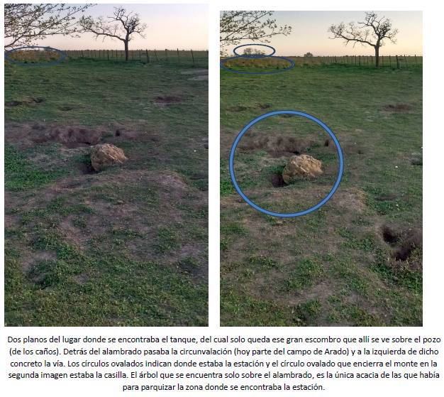 Para cuando mi abuelo compró el campo a Corona en 1948, diez años después de que la estación cerrara sus puertas, solo quedaba de ella las acacias y paraísos que parqueaban ese pedazo de pampa llana. De las edificaciones, solo pedazos de ladrillos, baldosas y algún que otro pedazo de concreto, que se iban tiempo al tiempo desperdigándose por el suelo y hundiéndose en sus profundidades. Los bordes y accidentes en el suelo dan fe de la presencia de cada una de las dependencias de la estación (colectora, galpón, baños, tanque, embarcadero y estación), pero aún éstas se van borrando de a poco. Las únicas dos cosas que aún se conservan es un toscón de ladrillos y cemento hundido en el pozo donde se levantaba el tanque, y el pozo ciego de los baños con su tapa de cemento intacta. Incluso las acacias y paraísos que parqueaban alrededor de la estación y a la vera de la circunvalación por donde se llegaba a la misma, se fueron secando (al día de hoy, 20 de julio de 2025 solo queda un ejemplar de acacia a la altura de donde se encontraba el tanque de agua a la vera del tramo de la circunvalación que ya no existe).