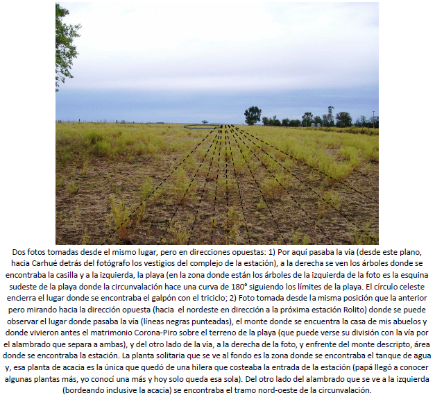 [x] En este tramo norte, mientras existió, los ferroviarios estacionaban (luego de que Torres se fuera dejando deshabitada la casilla), hacia el fondo de la misma, el triciclo que se usaba para limpiar y mantener las vías, papá se acuerda de haber visto como embocaban el carro y lo mandaban hasta el fondo.