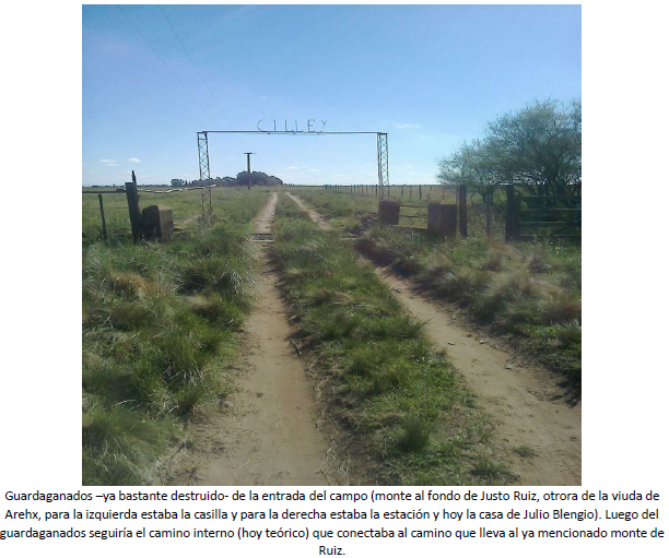 Pero el nombre Cilley sigue sobreviviendo y formando parte de la vida del Cuartel II del distrito de Adolfo Alsina (en esta sección “E” según la escritura), dándole nombre a la zona o paraje y alzándose su nombre desde el año 1974 sobre el guardaganado construido por Don Mateo Scheine[xi] (el “Bataráz” Fernández hizo la parte de herrería) de la actual entrada del campo de la familia Blengio que mi abuelo mandara a erigir en honor a la estación y que alguna vez fue… “la playa de la estación”.