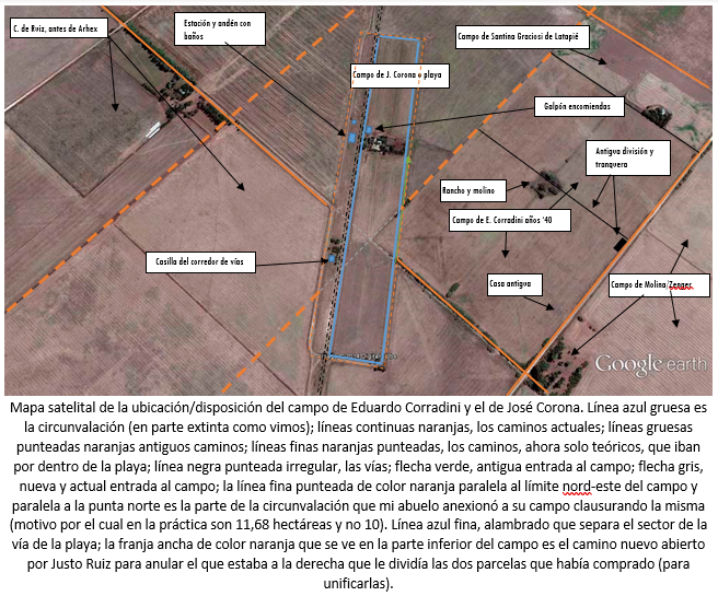 Catastralmente (para la escritura de venta por parte de la compañía) las distintas partes que componen la playa de la estación se dividen en “fracción A”, “fracción B”, “fracción C” (lotes comprados por Corona y luego por mi abuelo) y “fracción D” (también del área de Playa correspondiente en su momento al campo del Señor Joaquín Orzón). Esta última fracción fue vendida probablemente a Eduardo Corradini para completar sus 40 hectáreas que le faltaban en su momento a Orsón cuando vendió -ver plano-.  Luego está la fracción “E”, “F”, “G” y “H” que corresponde al área de vías y camino-circunvalación, propiedad de la compañía.