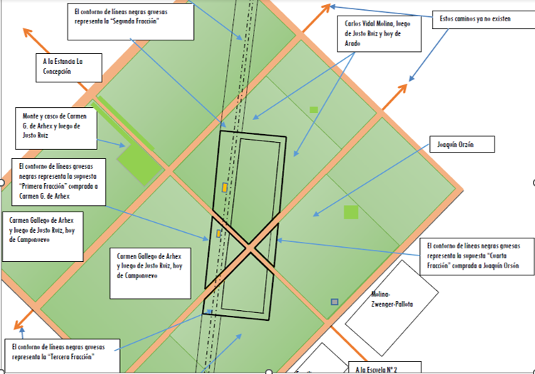 [iii] Es por esta razón que no sabemos cuándo vendieron la supuesta “cuarta Fracción” que pertenecía (o empezó a pertenecer al vendérsela la Compañía) a Joaquín Orzón, pero es de suponer que la venta se realizó en el mismo año y al propietario de la chacra lindante que, en definitiva, era la punta sud-oeste que le faltaba a dicha chacra. Posiblemente para esa fecha estuviera como propietario Eduardo Corradini.