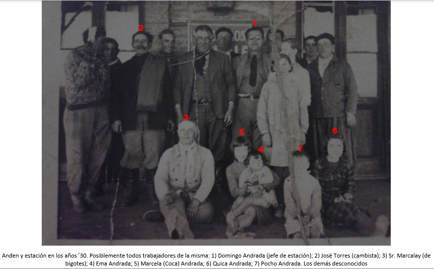 En los 27 años que funcionó la Estación, solo tengo el registro de dos jefes hasta el momento: Salvador García que al menos en 1930 estaba en funciones (no puedo saber cuántos años estuvo, ni mucho menos si fue el primer y único jefe hasta esa fecha), y Domingo Andrada, el último jefe, quien estuvo a cargo de la estación en sus últimos años de actividad hasta su cierre en 1938. Como todos los jefes de estación, éste vivía en la casa lindante al edificio principal junto a su familia. La misma estaba compuesta de su esposa, Doña María de Andrada, y sus cuatro hijos: Emma (la menor de todas), Marcela (Coca Andrada), “Quica” y el único varón, apodado “Pocho”. Es muy probable que estos niños hayan concurrido como alumnos a la Escuela Nº2 que se encontraba en los campos de Graciosi a 3 kilómetros de distancia.