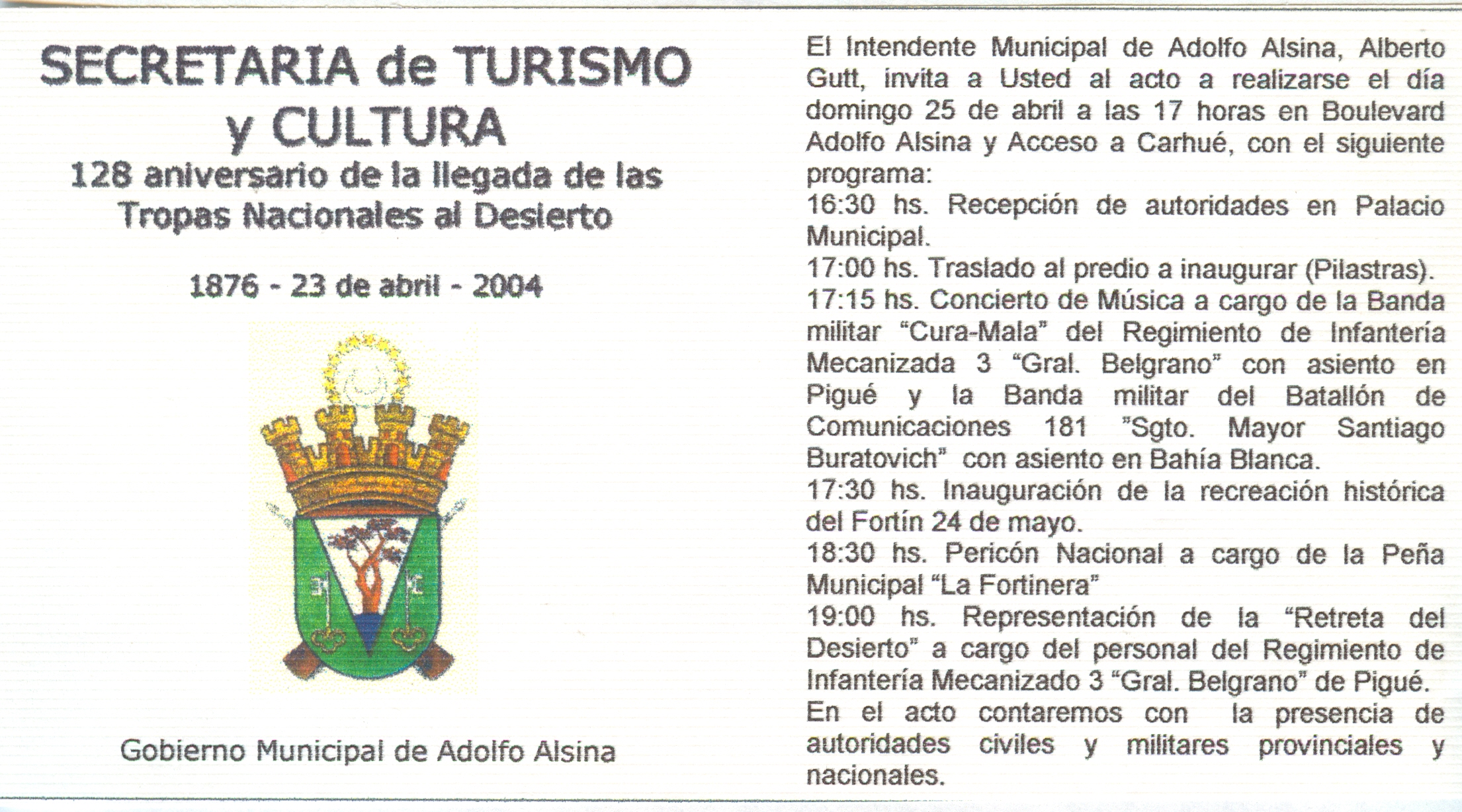 Esther Ramos, integrante fundadora de la Comision Amigos del Museo durante 2001-2004 llevó adelante un proyecto de registrar todos los eventos culturales anuales en Carhué. El 25 de abril de 2004 estuvo en la inauguración de la Recreación del fortin y esto dejó escrito: