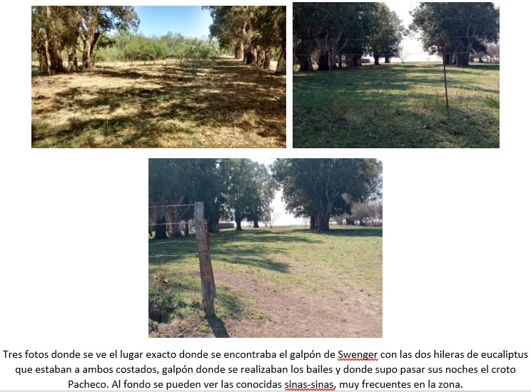 “…en cuanto al galpón se hacían los bailes, yo me acuerdo que atrás del galpón había un tinglado que estaba pegado al galpón y ahí Swenger guardaba la cosechadora que era una cosechadora de arrastre, creo que era una Mackormic 6 … y entonces Swenger la guardaba ahí. Que pasa, ahí es donde se hacían los asados para el baile, abajo de ese tinglado, claro y tenía la puerta, el portón. Entrando por ese portón, quiere decir esto de sudoeste a noreste entrando desde los asados, a la izquierda estaba la tarima donde estaba la orquesta, eso me acuerdo yo…”